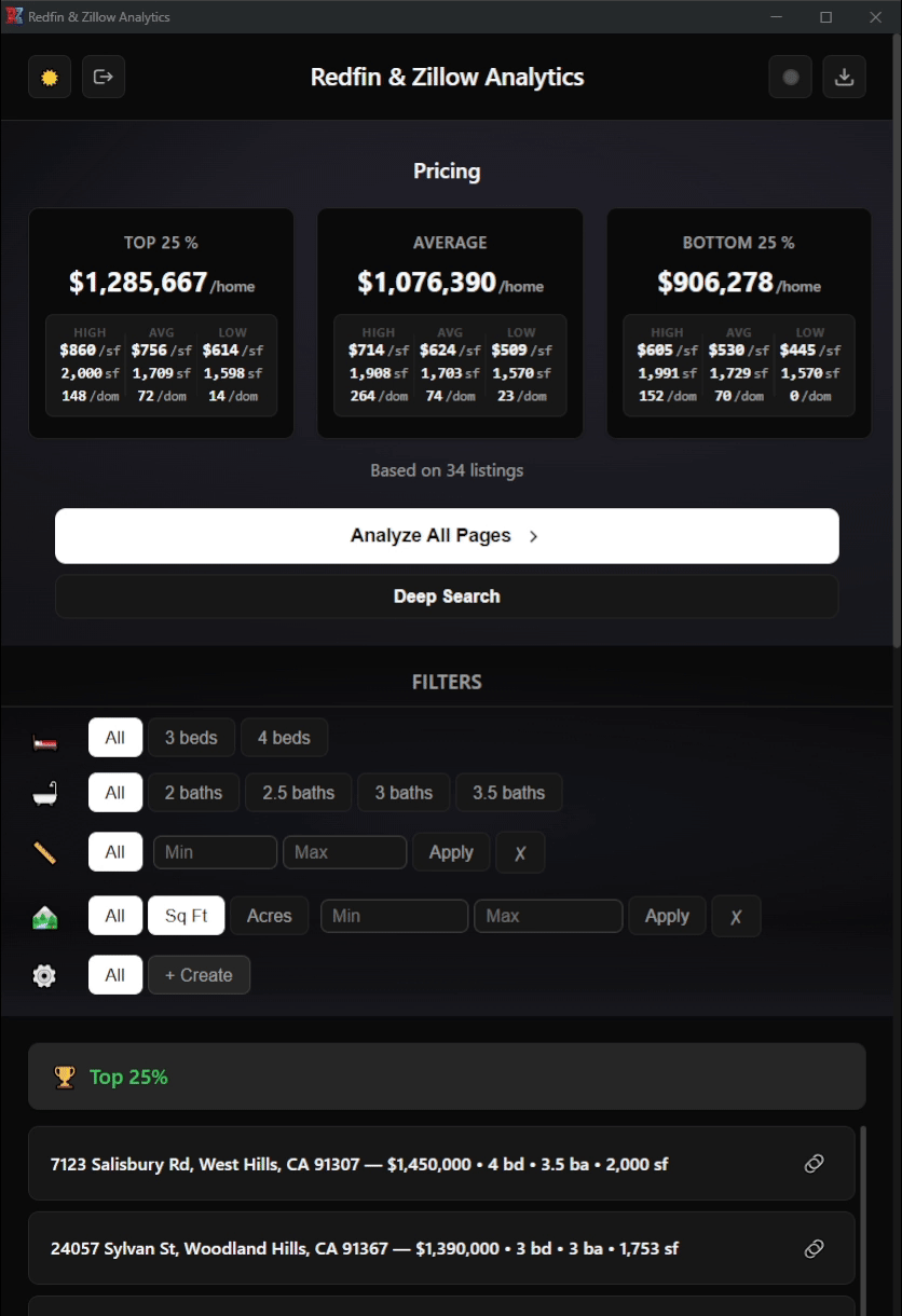 Use the sites you already trust (Redfin & Zillow) — then upgrade your workflow with instant insights + exports.